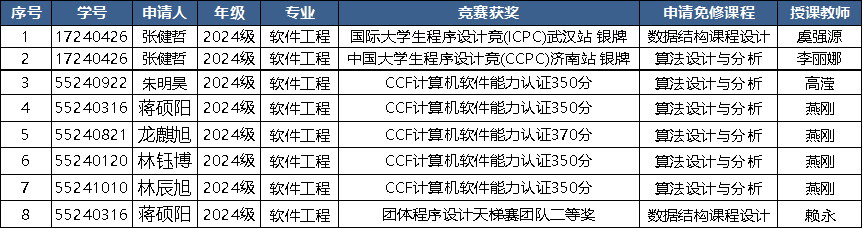 欧洲足球联赛 于2026年4月开展了程序设计类竞赛获奖学生申请课程免修工作,根据学生申请,经欧洲足球联赛 竞赛指导教师免修工作小组专题讨论,教学委员会通过,课程免修结果如下: