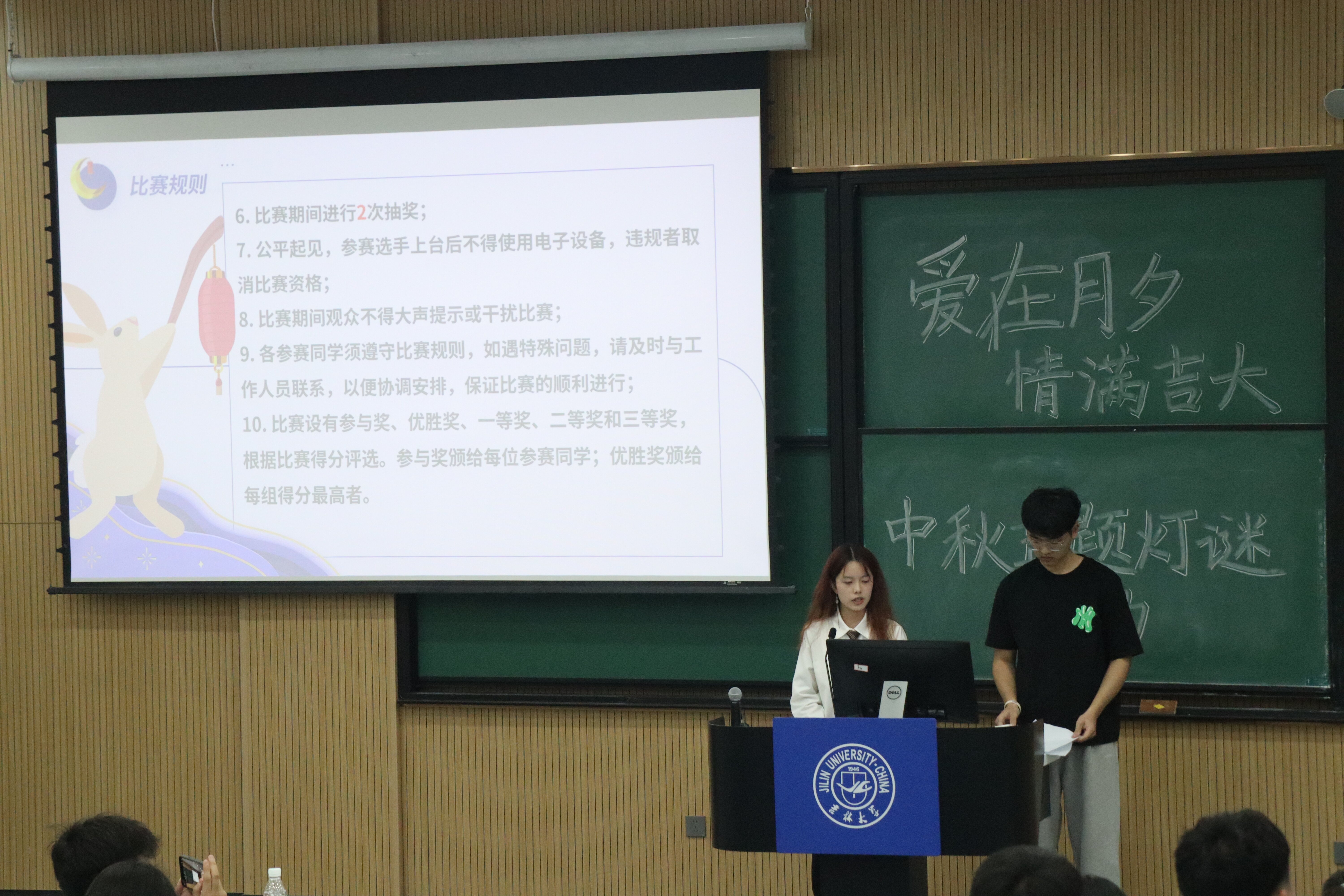 中秋节是中国传统文化中的重要节日,有着猜灯谜、吃月饼等美好习俗。为丰富同学们的大学生活,增强同学们的文化自信,我院学生会宣传部于9月27日晚七点,在敬信教学楼F10阶梯教室开展了一场以“爱在月夕·情满吉大”为主题的猜灯谜大赛。同学们踊跃参与,共同感受中秋佳节的无穷魅力。