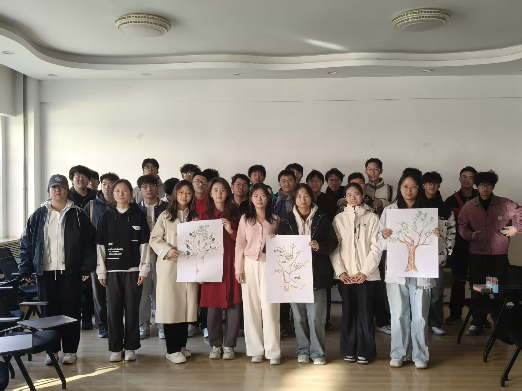 活动后期,“快乐传递”环节让新生们在纸上写下对彼此的印象,轮转的纸张为每个人带来温暖反馈。“我爱我班”环节中,新生用三个词描述理想班级,在分享中凝聚班级共同目标。最后,大家一起绘制“团体树”,以集体创作的方式见证班级凝聚力的形成。活动在全体合影中落下帷幕,拍摄的照片成为记录新生成长与班级情谊的珍贵印记。